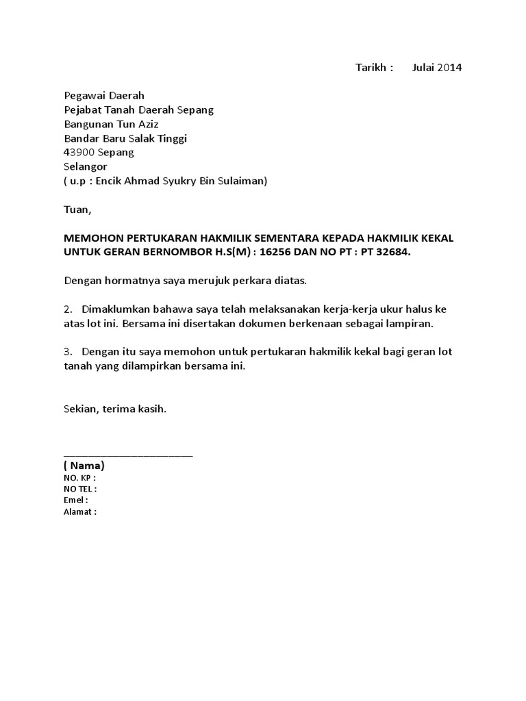 Contoh No Hak Milik Untuk Hak Milik Sementara Tanah